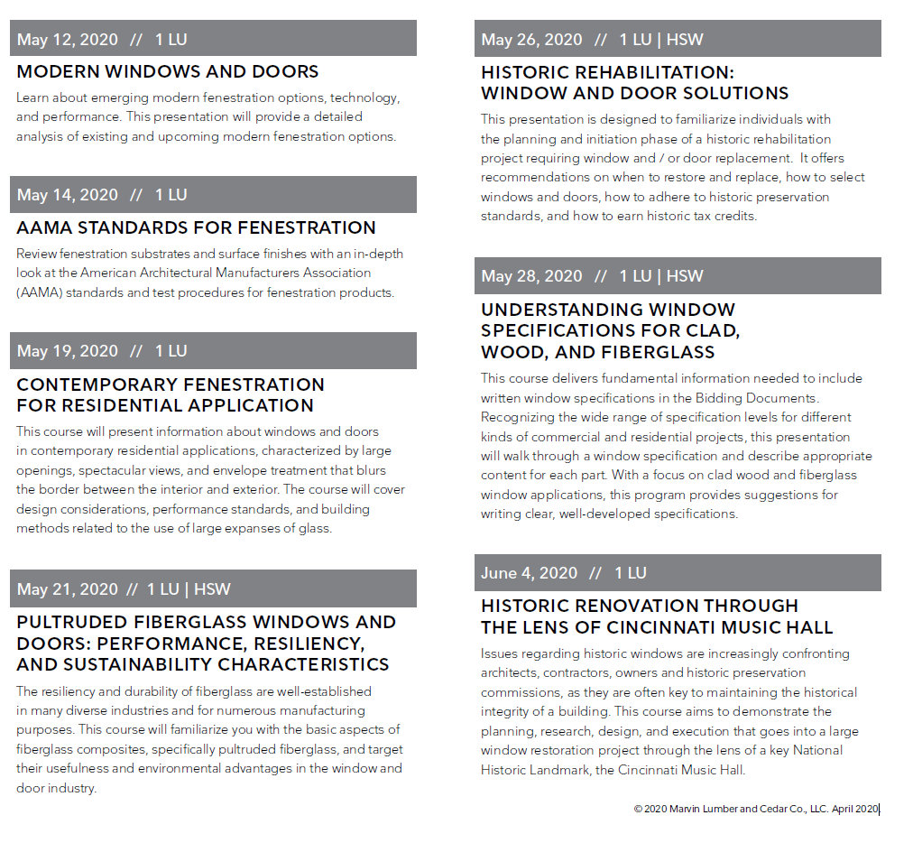 Thanks to all our Corporate Affiliate members and sponsors who help sustain the chapter! We’d like to highlight some HSW program being offered by two of our Copper Sponsors: Pella and Marvin. These are great opportunities for some additional credits.